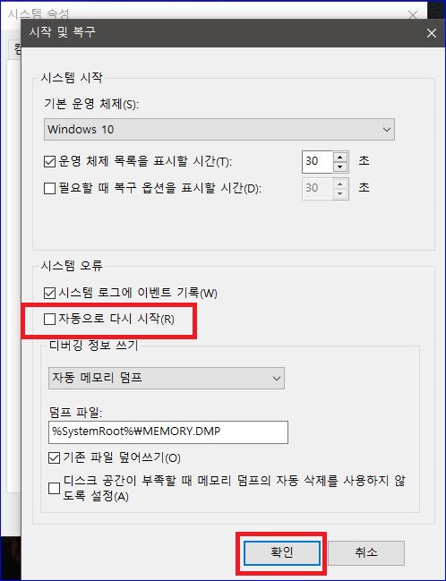 이제부터 시스템이 오류가 발생해도 강제적으로 재부팅 되지 않습니다.