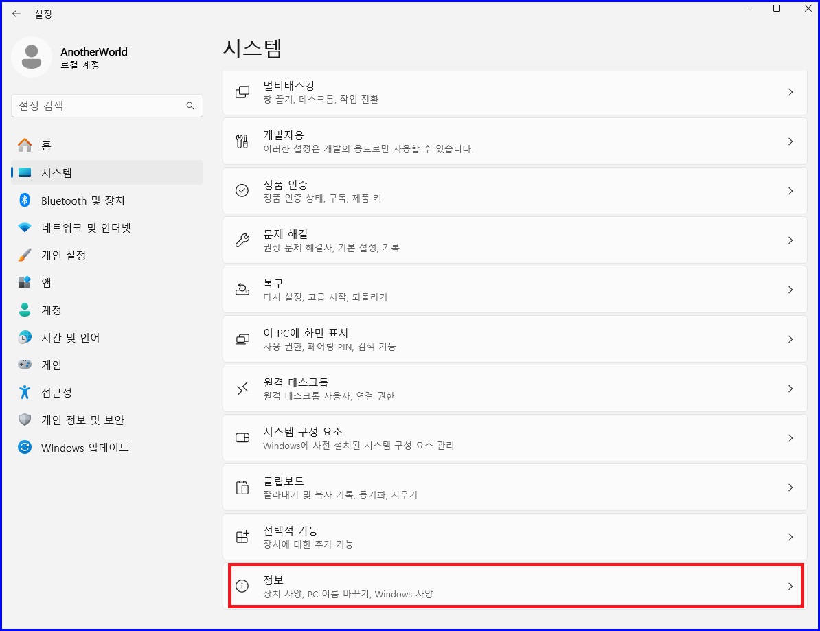 아래로 드래그해서 "정보" 항목을 클릭합니다.