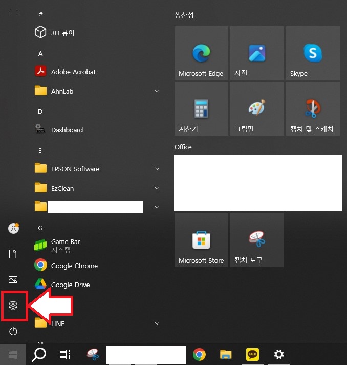 "시작"에서 톱니바퀴 모양의 "설정"을 선택합니다.