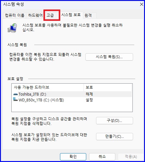 "고급"탭을 선택합니다.