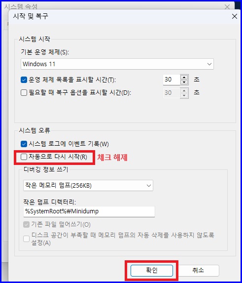 윈도우 11에서 시스템 오류로 인한 자동 재부팅 방지하는 방법