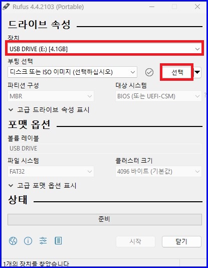 "장치"에 보시면 준비된 4G USB 메모리가 잘 인식되고 있는 걸 확인할 수 있습니다.