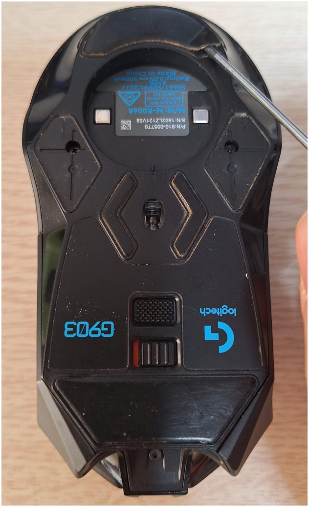 로지텍 G903 마우스에 장착된 나사 중 유일하게 육각 별 나사가 한 개 있습니다.
