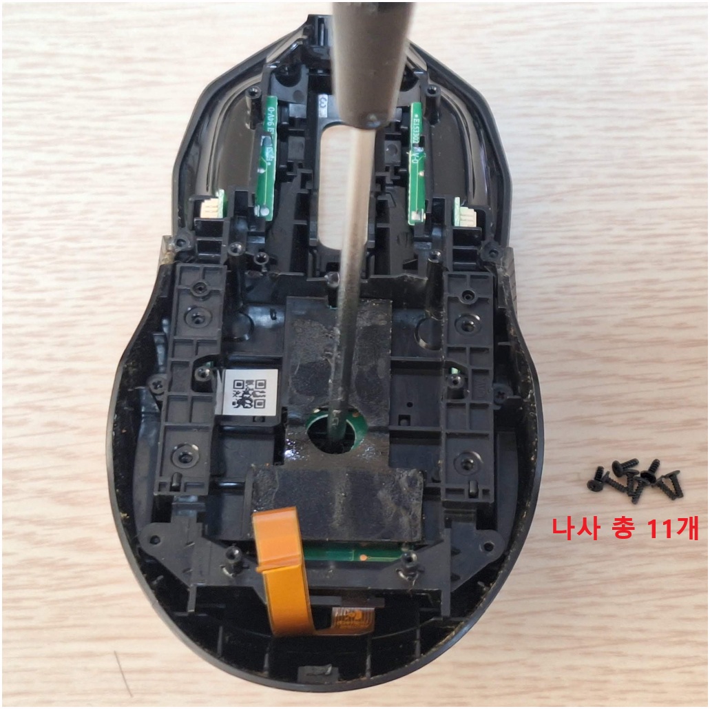 마우스 아랫면 상단부에 위치한 육각 별 나사도 풀어줍니다.
